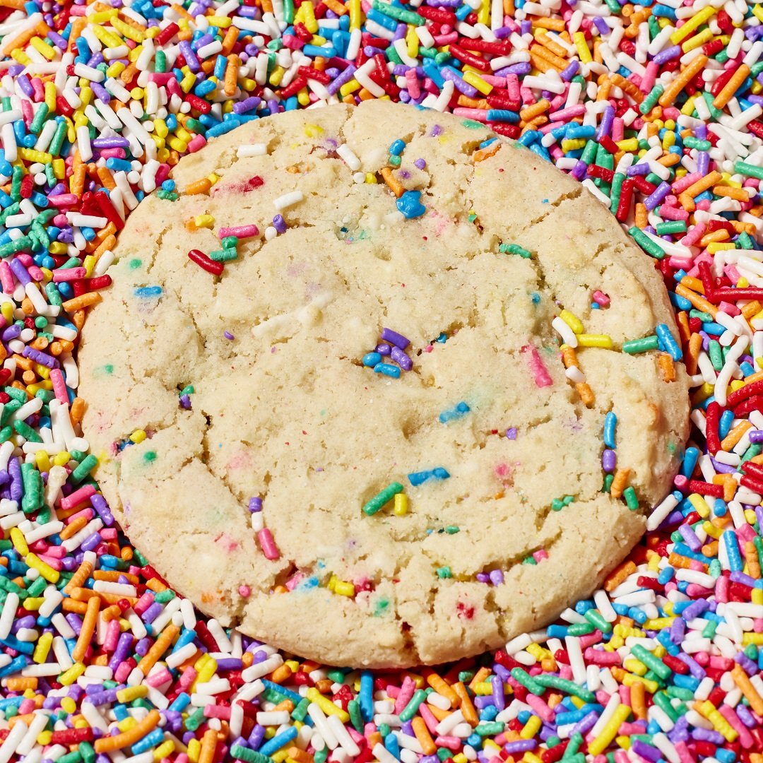 All those familiar box-mix Birthday Cake flavors — dreamy vanilla, rich butter, rainbow sprinkles — combine in fluffy, chewy sugar cookie heaven.